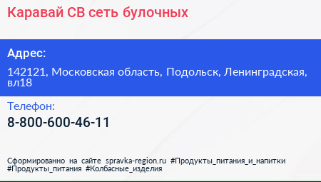 Каравай СВ, сеть булочных по адресу 142121, Московская область, Подольск, Ленинградская, вл18 в дальнейшем Организация, размещена в следующих категориях: