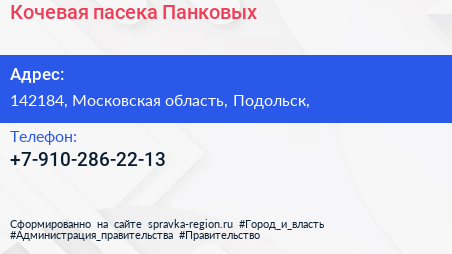 Кочевая пасека Панковых по адресу 142184, Московская область, Подольск, в дальнейшем Организация, размещена в следующих категориях: