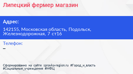 Липецкий фермер, магазин по адресу 142155, Московская область, Подольск, Железнодорожная, 7 ст16 в дальнейшем Организация, размещена в следующих категориях: