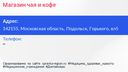 Магазин чая и кофе по адресу 142155, Московская область, Подольск, Горького, вл5 в дальнейшем Организация, размещена в следующих категориях:
