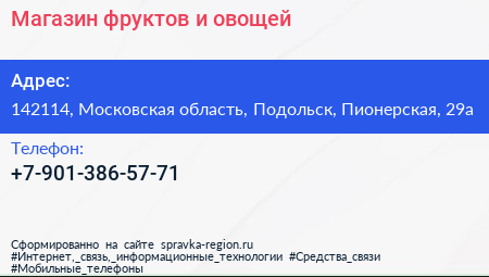 Магазин фруктов и овощей по адресу 142114, Московская область, Подольск, Пионерская, 29а в дальнейшем Организация, размещена в следующих категориях: