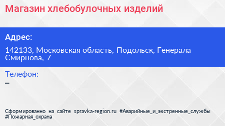 Магазин хлебобулочных изделий по адресу 142133, Московская область, Подольск, Генерала Смирнова, 7 в дальнейшем Организация, размещена в следующих категориях: