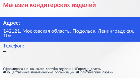 Магазин кондитерских изделий по адресу 142121, Московская область, Подольск, Ленинградская, 10в в дальнейшем Организация, размещена в следующих категориях: