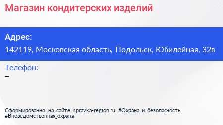 Магазин кондитерских изделий по адресу 142119, Московская область, Подольск, Юбилейная, 32в в дальнейшем Организация, размещена в следующих категориях: