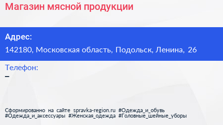 Магазин мясной продукции по адресу 142180, Московская область, Подольск, Ленина, 26 в дальнейшем Организация, размещена в следующих категориях: