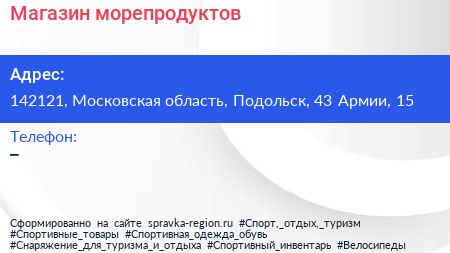 Магазин морепродуктов по адресу 142121, Московская область, Подольск, 43 Армии, 15 в дальнейшем Организация, размещена в следующих категориях: