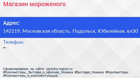 Магазин мороженого по адресу 142119, Московская область, Подольск, Юбилейная, вл30 в дальнейшем Организация, размещена в следующих категориях: