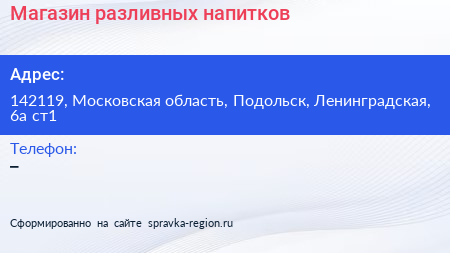 Магазин разливных напитков по адресу 142119, Московская область, Подольск, Ленинградская, 6а ст1 в дальнейшем Организация, размещена в следующих категориях: