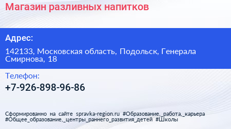 Магазин разливных напитков по адресу 142133, Московская область, Подольск, Генерала Смирнова, 18 в дальнейшем Организация, размещена в следующих категориях: