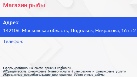 Магазин рыбы по адресу 142106, Московская область, Подольск, Некрасова, 16 ст2 в дальнейшем Организация, размещена в следующих категориях:
