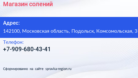 Магазин солений по адресу 142100, Московская область, Подольск, Комсомольская, 3 в дальнейшем Организация, размещена в следующих категориях: