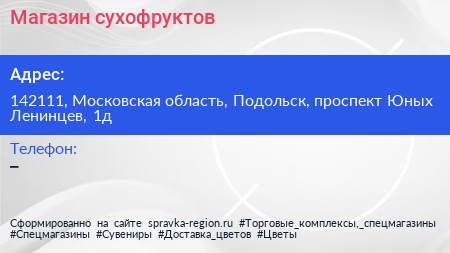 Магазин сухофруктов по адресу 142111, Московская область, Подольск, проспект Юных Ленинцев, 1д в дальнейшем Организация, размещена в следующих категориях: