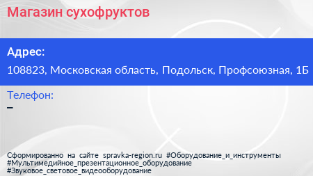 Магазин сухофруктов по адресу 108823, Московская область, Подольск, Профсоюзная, 1Б в дальнейшем Организация, размещена в следующих категориях: