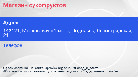 Магазин сухофруктов по адресу 142121, Московская область, Подольск, Ленинградская, 21 в дальнейшем Организация, размещена в следующих категориях: