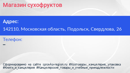 Магазин сухофруктов по адресу 142110, Московская область, Подольск, Свердлова, 26 в дальнейшем Организация, размещена в следующих категориях:
