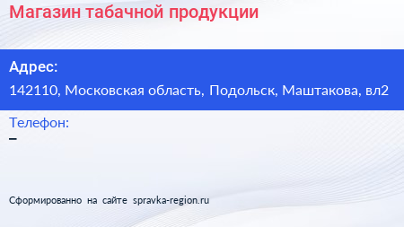 Магазин табачной продукции по адресу 142110, Московская область, Подольск, Маштакова, вл2 в дальнейшем Организация, размещена в следующих категориях: