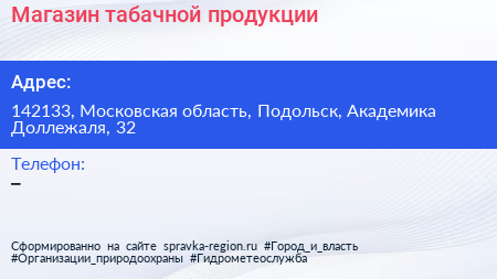 Магазин табачной продукции по адресу 142133, Московская область, Подольск, Академика Доллежаля, 32 в дальнейшем Организация, размещена в следующих категориях: