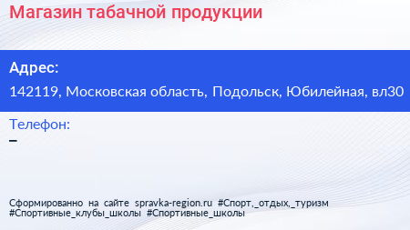 Магазин табачной продукции по адресу 142119, Московская область, Подольск, Юбилейная, вл30 в дальнейшем Организация, размещена в следующих категориях: