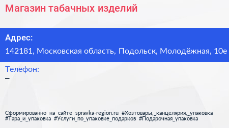 Магазин табачных изделий по адресу 142181, Московская область, Подольск, Молодёжная, 10е в дальнейшем Организация, размещена в следующих категориях: