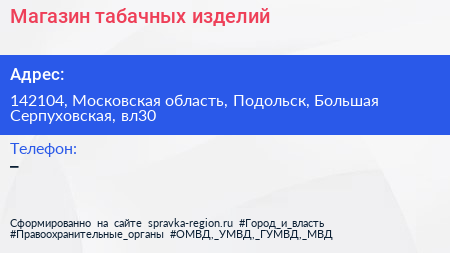 Магазин табачных изделий по адресу 142104, Московская область, Подольск, Большая Серпуховская, вл30 в дальнейшем Организация, размещена в следующих категориях: