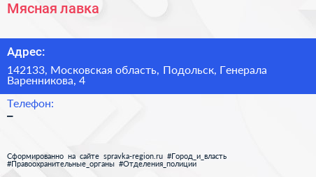 Мясная лавка по адресу 142133, Московская область, Подольск, Генерала Варенникова, 4 в дальнейшем Организация, размещена в следующих категориях: