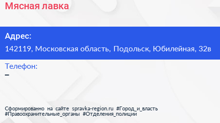 Мясная лавка по адресу 142119, Московская область, Подольск, Юбилейная, 32в в дальнейшем Организация, размещена в следующих категориях: