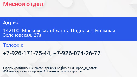 Мясной отдел по адресу 142100, Московская область, Подольск, Большая Зеленовская, 27а в дальнейшем Организация, размещена в следующих категориях: