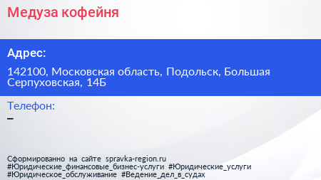 Медуза, кофейня по адресу 142100, Московская область, Подольск, Большая Серпуховская, 14Б в дальнейшем Организация, размещена в следующих категориях: