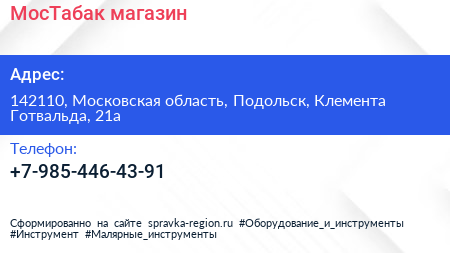 МосТабак, магазин по адресу 142110, Московская область, Подольск, Клемента Готвальда, 21а в дальнейшем Организация, размещена в следующих категориях: