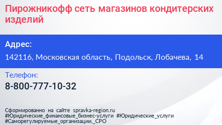 Пирожникофф, сеть магазинов кондитерских изделий по адресу 142116, Московская область, Подольск, Лобачева, 14 в дальнейшем Организация, размещена в следующих категориях:
