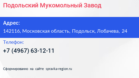 Подольский Мукомольный Завод по адресу 142116, Московская область, Подольск, Лобачева, 24 в дальнейшем Организация, размещена в следующих категориях: