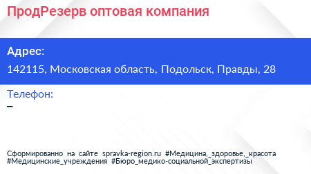ПродРезерв, оптовая компания по адресу 142115, Московская область, Подольск, Правды, 28 в дальнейшем Организация, размещена в следующих категориях: