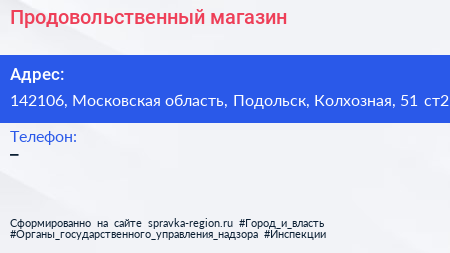 Продовольственный магазин по адресу 142106, Московская область, Подольск, Колхозная, 51 ст2 в дальнейшем Организация, размещена в следующих категориях: