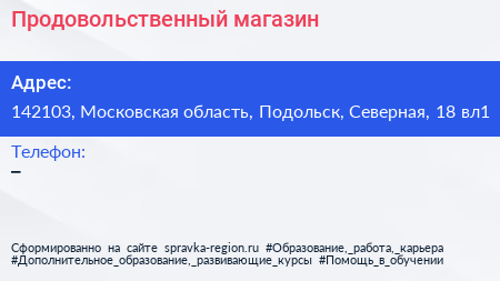 Продовольственный магазин по адресу 142103, Московская область, Подольск, Северная, 18 вл1 в дальнейшем Организация, размещена в следующих категориях: