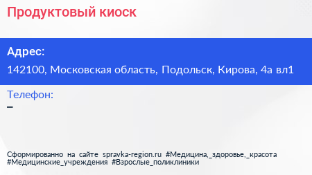 Продуктовый киоск по адресу 142100, Московская область, Подольск, Кирова, 4а вл1 в дальнейшем Организация, размещена в следующих категориях: