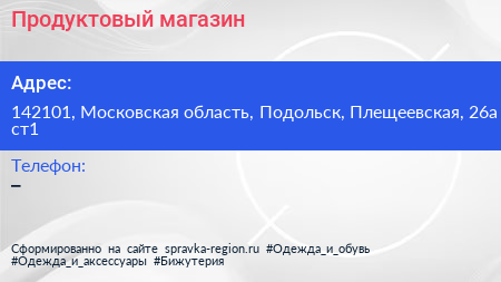 Продуктовый магазин по адресу 142101, Московская область, Подольск, Плещеевская, 26а ст1 в дальнейшем Организация, размещена в следующих категориях: