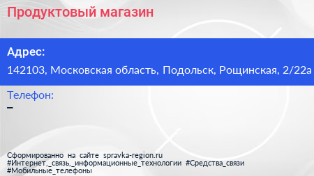 Продуктовый магазин по адресу 142103, Московская область, Подольск, Рощинская, 2/22а в дальнейшем Организация, размещена в следующих категориях: