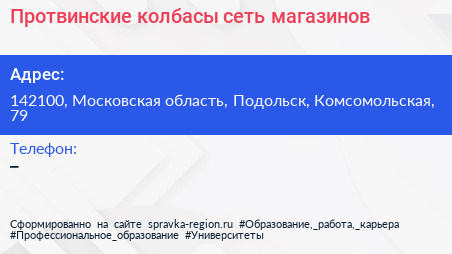 Протвинские колбасы, сеть магазинов по адресу 142100, Московская область, Подольск, Комсомольская, 79 в дальнейшем Организация, размещена в следующих категориях: