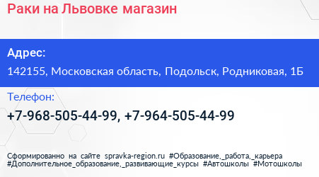 Раки на Львовке, магазин по адресу 142155, Московская область, Подольск, Родниковая, 1Б в дальнейшем Организация, размещена в следующих категориях: