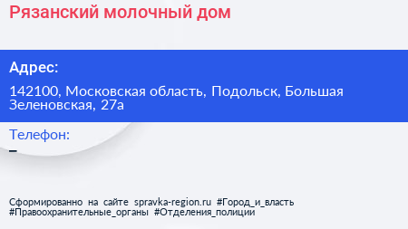 Рязанский молочный дом по адресу 142100, Московская область, Подольск, Большая Зеленовская, 27а в дальнейшем Организация, размещена в следующих категориях: