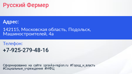 Русский Фермер по адресу 142115, Московская область, Подольск, Машиностроителей, 4а в дальнейшем Организация, размещена в следующих категориях:
