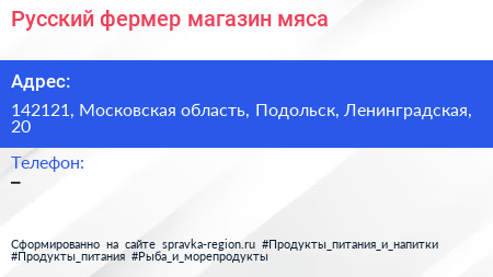 Русский фермер, магазин мяса по адресу 142121, Московская область, Подольск, Ленинградская, 20 в дальнейшем Организация, размещена в следующих категориях: