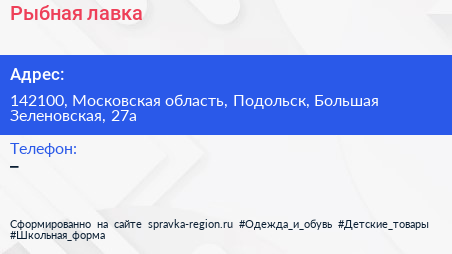 Рыбная лавка по адресу 142100, Московская область, Подольск, Большая Зеленовская, 27а в дальнейшем Организация, размещена в следующих категориях: