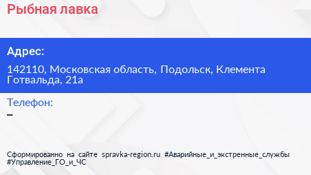 Рыбная лавка по адресу 142110, Московская область, Подольск, Клемента Готвальда, 21а в дальнейшем Организация, размещена в следующих категориях: