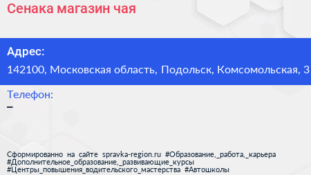 Сенака, магазин чая по адресу 142100, Московская область, Подольск, Комсомольская, 3 в дальнейшем Организация, размещена в следующих категориях: