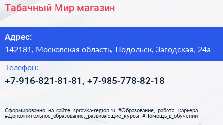 Табачный Мир, магазин по адресу 142181, Московская область, Подольск, Заводская, 24а в дальнейшем Организация, размещена в следующих категориях: