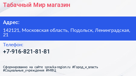 Табачный Мир, магазин по адресу 142121, Московская область, Подольск, Ленинградская, 21 в дальнейшем Организация, размещена в следующих категориях: