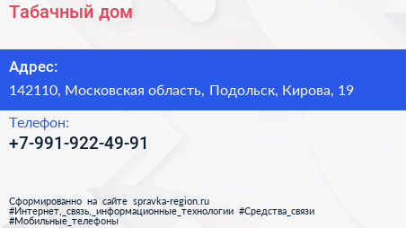 Табачный дом по адресу 142110, Московская область, Подольск, Кирова, 19 в дальнейшем Организация, размещена в следующих категориях: