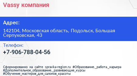 Vassy, компания по адресу 142104, Московская область, Подольск, Большая Серпуховская, 43 в дальнейшем Организация, размещена в следующих категориях: