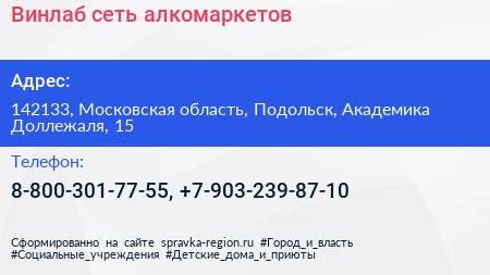 Винлаб, сеть алкомаркетов по адресу 142133, Московская область, Подольск, Академика Доллежаля, 15 в дальнейшем Организация, размещена в следующих категориях: